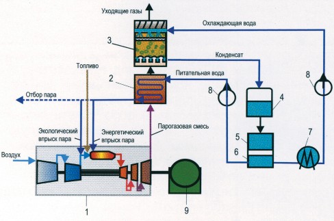 Как парогазовые, так и газопаровые установки могут работать в когенерационных схемах, то есть вырабатывать при необходимости и электроэнергию, и теплоту.