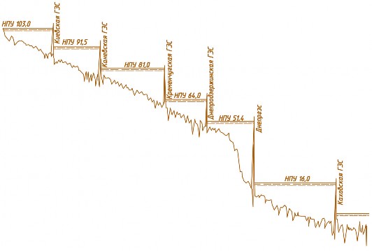 Рис. 3.2. Днепровский каскад ГЭС (продольный профиль)
