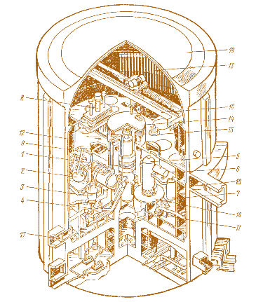 Рис. 4.6. Реакторное отделение пятого энергоблока Нововоронежской АЭС: 1 – реактор ВВЭР-1000; 2 – парогенератор ПГВ-1000; 3 – главный циркуляционный насос; 4 – главная запорная задвижка; 5 – компенсатор объема; 6 – барботажный бак; 7 – бак для аварийного запаса раствора бора; 8 – перегрузочная машина; 9 – главные паропроводы; 10 – круговой мостовой электрический кран; 11 – центробежный вентилятор; 12 – вентиляционный короб; 13 – запасные штанги СУЗ; 14 – крышка над бетонной шахтой реактора; 15 – люк над главной запорной задвижкой; 16 – площадка обслуживания; 17 – основной шлюз; 18 – помещение электриков; 19 – железобетонная защитная оболочка