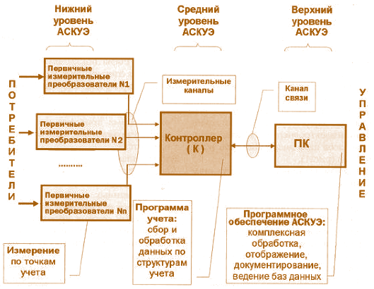 Решение проблемы учета электроэнергии требует создания автоматизированных систем контроля и учета, которые в общем случае содержат два или три уровня (рис. 6.2):
